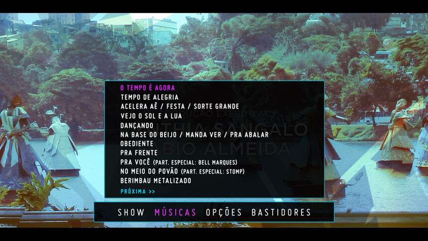 Setlist: 01. O Tempo ? Agora (Abertura) 02. Tempo de Alegria 03. Acelera A? (Noite do Bem) / Festa / Sorte Grande 04. Vejo o Sol e a Lua 05. Dan?ando 06. Na Base do Beijo / Manda Ver / Pra Abalar 07. Obediente 08. Pra Frente 09. Pra Voc? (part. Bell Marques) 10. No Meio do Pov?o / Cita??o: Depois Que o Il? Passar (part. Stomp) 11. Berimbau Metalizado 12. Flor do Reggae / Mega Beijo 13. Amor Que N?o Sai 14. Master Blaster (Jammin’) 15. Could You Be Loved / Cita??o Musical do Rap: Se Ligue (part. Alexandre Carlo) 16. Adeus Bye Bye 17. Muito Obrigado Ax? 18. Beleza Rara / Tum, Tum, Goiaba / Pra Sempre Ter Voc? / F? / Miragem / Eva (Eva) 19. Fara? (Divindade do Egito) / Ladeira do Pel? / Doce Obsess?o (part. Olodum) 20. No Brilho Desse Olhar 21. Me Engana Que Eu Gosto (part. Alexandre Pires) 22. Beijo de Hortel? 23. Faz Tempo / Deixo 24. S? Num Sonho 25. Se Eu N?o Te Amasse Tanto Assim / Quando a Chuva Passar 26. Cruisin' (part. Saulo Fernandes) 27. Real Fantasia 28. Cad? Dalila / M?sica Pra Pular Brasileira / Cita??o Instrumental: ?ndio Quer Apito 29. Empurra, Empurra / Arer? 30. Careless Whisper